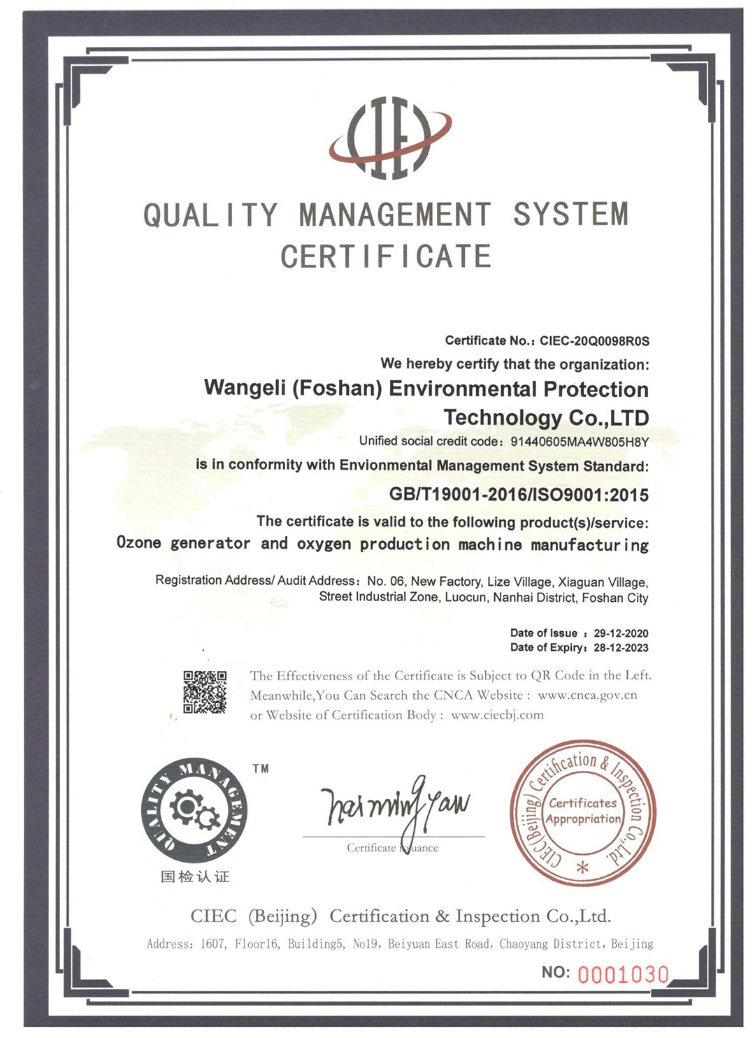 Wangeli (Foshan) Environmental Protection Technology Co., Ltd. is a modern high-tech enterprise specializing in the research and development, manufacturing, and trade of ozone generator accessories, large, medium, and small ozone machines. The product is widely used in water treatment, cosmetics container disinfection and sterilization, aquaculture oxygenation disinfection and sterilization, poultry farming, swimming pool water disinfection and sterilization, sterile workshops, pharmaceutical and food factories disinfection and sterilization, GMP certification, food preservation and storage, fruit and vegetable pesticide degradation, sewage treatment (deep treatment of industrial and urban sewage in dyeing plants, electroplating plants, chemical plants, etc.), industrial waste gas deodorization treatment, and other fields.
