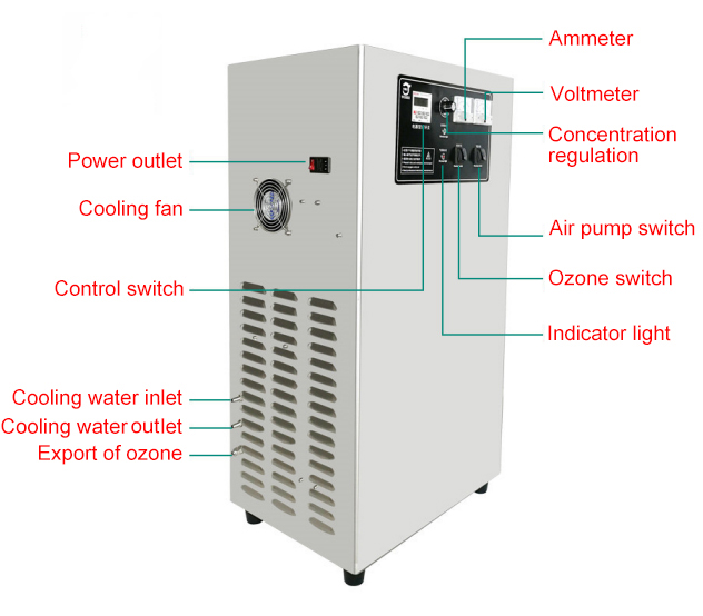 Machine configuration | Micro-gap discharge ozone tube, high-frequency high-voltage power supply, air compression pump, air filter, strong cooling fan, control circuit (timer, working indicator, air pump switch, ozone switch, etc) | ||
